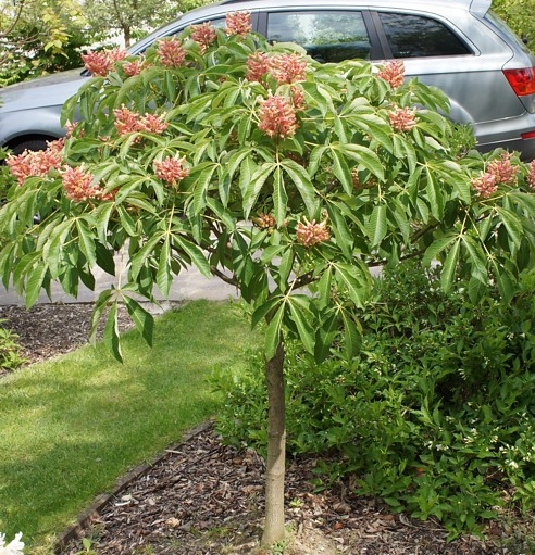 Саженцы Каштана конского Павия Дисколор (pavia var. discolor) – карликовое дерево, высота которого не превышает 200 сантиметров, с округлой густой кроной и гладким темно-серым стволом. Листья сине-зеленого оттенка по пять штук собраны в свисающие зонтики. Цветы имеют абрикосово-оранжевую расцветку и собраны в конусовидные соцветия.