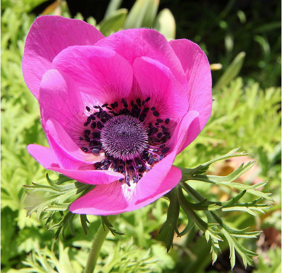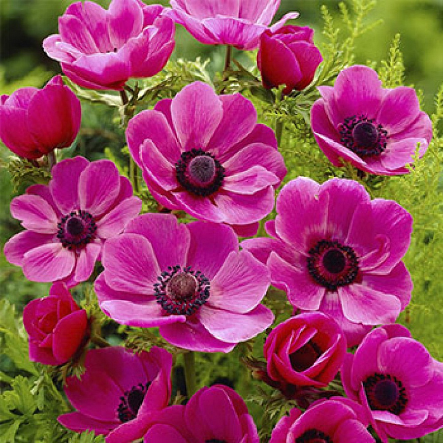 Луковицы анемоны простой Сильфиды (Sylphide) вырастают в эффектные невысокие растения с яркими сиренево-алыми цветами. Бархатистые широкие лепестки раскрываются в роскошные чаши с черной сердцевиной. Под цветками раскидывается зеленое облако резной листвы. Название многолетника в переводе с греческого означает «дочь ветров». Нежные лепестки завораживающе отзываются на легчайшее дуновение ветра.