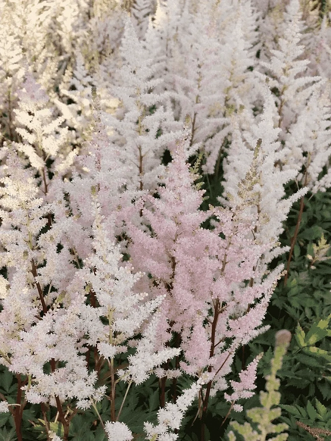 Рассада астильбы Арендса Бумбальда (Bumalda) станет центром внимания в саду, когда зацветет точеными белыми цветками на фоне ярко-зеленой листвы. Создается впечатление, что растение среди лета покрылось белым инеем. Особенно контрастно смотрятся темно-красные черешки, на которых покоятся сотни белых с перламутром цветов.