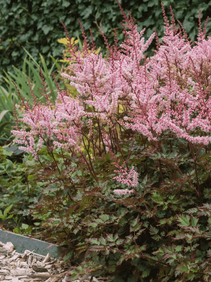 Рассада астильбы Арендса Дельфт Лейс (Delft Lace) украсит сад живописным цветением мелких розовых звездочек на темно-малиновых черешках. Пушистые, благодаря обилию цветков, побеги покоятся на зеленом облаке резной листвы. Молодые побеги бордового оттенка зеленеют к середине лета. Цветение начинается в июле-августе, в зависимости от климата.