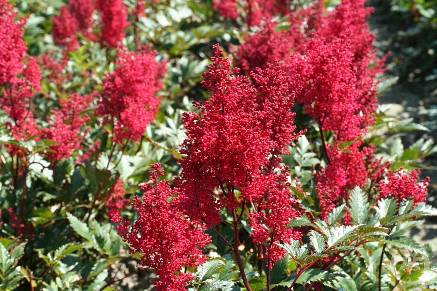 Рассада астильбы Арендса Этна (Etna) вырастают в оригинальные растения с посеченными темно-зелеными листьями и ажурными красными соцветиями ромбовидной формы. Отдельные цветки очень мелкие, и неразличимы на расстоянии. Побеги с соцветиями напоминают ажурные метелки длиной до 25 см. Цветение начинается во второй половине лета и длится до 40 дней.
