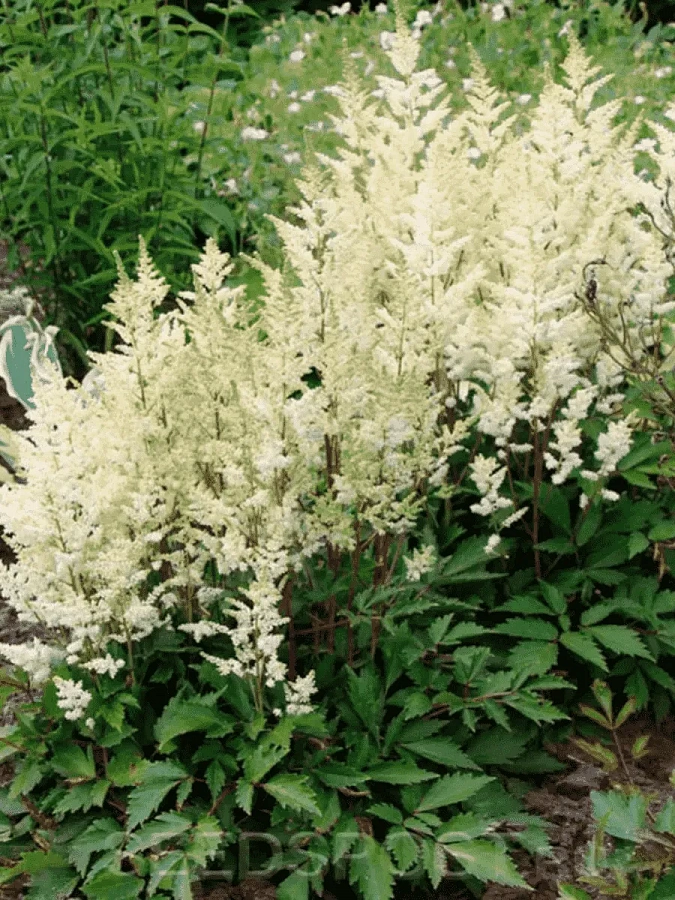 Рассада астильбы гибридной Юник Уайт (Younique White): тонкое и изящное травянистое растение с тонкими белыми соцветиями на невесомых поникающих побегах. Листва мелкая, темно-зеленая, с резными краями. Цветки посажены очень плотно, поэтому соцветия кажутся покрытыми белым инеем. Период цветения июль-август, затем на цветоножках завязываются семена.