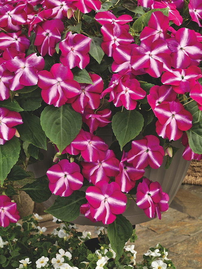 Бальзамин ампельный тумблер виолет стар - это удивительное растение с пурпурно-фиолетовыми цветками, украшенными белой звездой. Его изящные стебли достигают высоты до 30-40 см, а диаметр цветка составляет 4-5 см. Листья этого растения имеют форму сердца и создают неповторимый вид ампельной композиции.