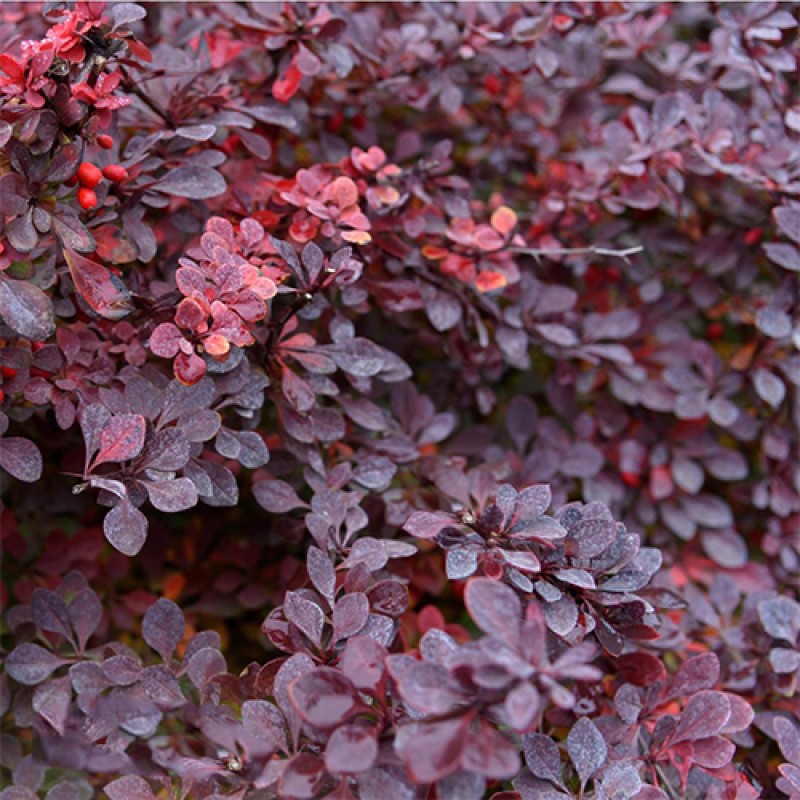 Саженцы кустарника барбарис Кармен (Carmen) – представляют собой необыкновенный впечатляющий своим внешним видом сорт. Его листва отличается насыщенно ярко-красным цветом, что позволяет кардинально поменять любую композицию в ландшафте. Побеги растения темно-коричневого цвета, они дугообразно отклоняются в сторону. Листья округлой формы, а цветение происходит в мае. Цветы на кустарнике желтые, собранные в соцветия-кисти диаметром 1 см. Из цветов впоследствии вырастают ягоды красного цвета, продолговатые до 1 см в длину. Созревают они ближе к октябрю. Сорт Кармен может приживаться в любой почве, но любит обилие солнечного цвета, а в тени утрачивает уникальный цвет листьев, которые сразу же зеленеют.