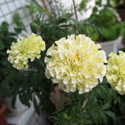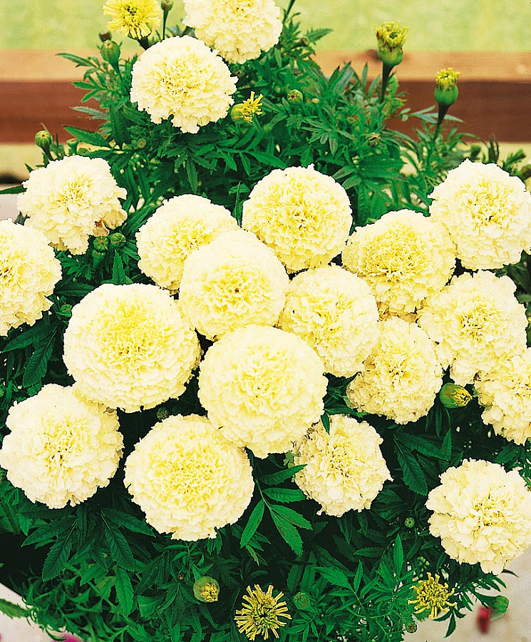 Бархатцы прямостоячие эскимо - это удивительное растение с ванильно-белыми цветками, которые расцветают в течение нескольких месяцев в году. Эти красавцы достигают высоты до 40 см и имеют диаметр до 10 см, что делает их идеальным выбором для групповых посадок в солнечных местах.