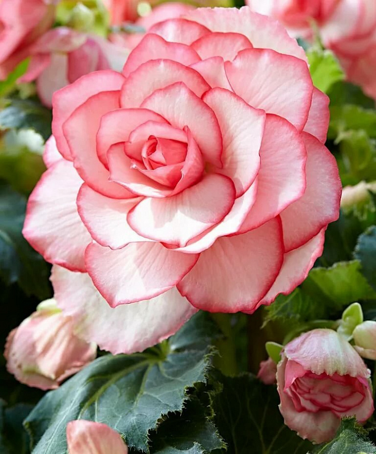 Луковицы бегонии клубневой Bouton de Rose высаживают в открытый грунт в конце весны. В конце осени растения следует выкапывать и помещать в сухое прохладно место. Бегония клубневая Bouton de Rose — это компактный многолетник, который поднимается в высоту от 20 до 30 см. Кустик обычно имеет полусферическую форму. Цветочки крупные, имеют удивительную окраску лепестков. Они светло-розового цвета с насыщенно-розовой каемкой. Смотрятся такие цветочки очень эффектно не только на клумбе, но и в уличных вазонах, балконных ящиках. Располагать растение рекомендуют на солнечных участках с питательной почвой.