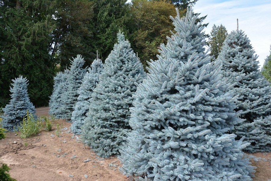 Саженцы ели голубой (Picea pungens) вырастают в живописные деревья, правильной конусообразной формы, с широкими дымчатыми «лапами» ветвей. Красивый оттенок хвое придает большое количество воскового налета. У взрослых крупномеров нижние ветки слегка ниспадают к земле, образуя вокруг широкие юбки. Высота ели голубой достигает 30м. На голубовато-зеленой острой хвое эффектно выделяются молодые оранжевые побеги. Бурые шишки в процессе созревания зеленеют, затем буреют. Достоинства: