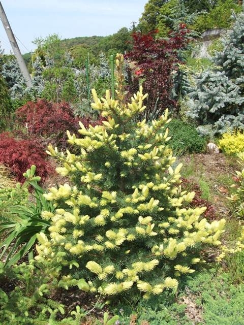 Саженцы Ели колючей Майголд (Maigold) – уникальный вид голубой ели с зеленой хвоей. Крона растения вертикальная, среднерослая, с формой конуса. Растет дерево средними темпами. в период мая-июня можно видеть золотисто-желтый цвет весеннего прироста, который со временем набирает зеленый цвет. Высота растения 5-6 метров, а диаметр 3 метра. Ель колючей Майголд предпочитает освещенное место или полутень. В тени она вытягивается и теряет насыщенный окрас. Предпочтительна почва, богатая элементами, суглинок и мульчирование приствольного круга. Любит умеренный полив, дождевание кроны. В весенне-Осеннего период нужна обработка элементами меди.