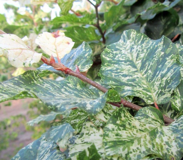 Саженцы Бука лесного европейского Марквард (Fagus sylvatica) – декоративное лиственное дерево, привлекательное при создании кустарно-древесных композиций за счет необычной расцветки листвы. Вырастает до 3 м в высоту. Имеет эллиптическую форму листьев с пестрой неоднородной расцветкой. Весной листья бело-зеленые, летом – желто-зеленые, сравнительно крупные.
