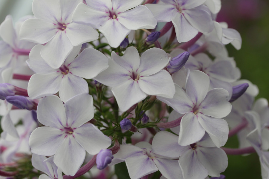 Рассада флокса метельчатого Жуковский порадует привлекательной окраской соцветий и их нежным ароматом. Крупные цветы состоят из белых лепестков, на поверхности которых проступают сиренево-фиолетовые штрихи. Этот изящный сорт подходит для одиночных и групповых посадок.