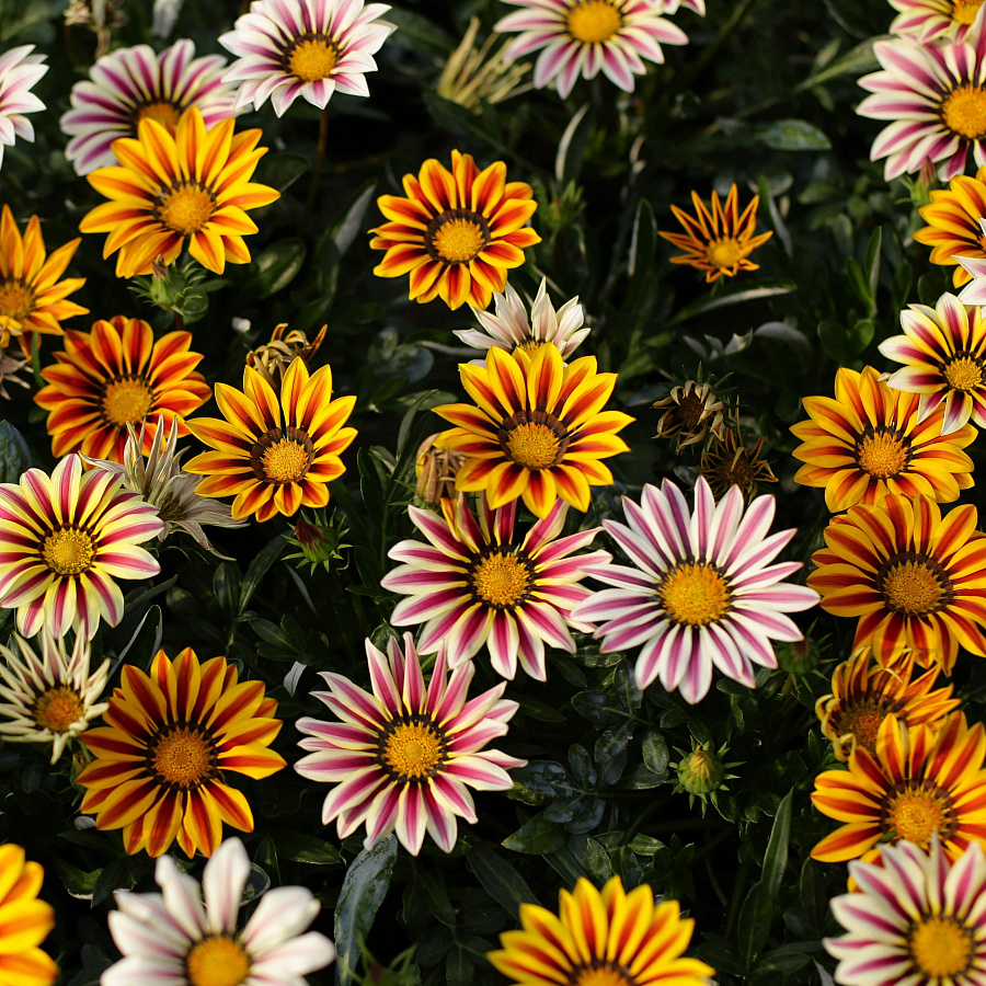 Семена газании (гацании) смесь окрасок – отличная возможность наполнить сад яркими красками. Эффектные невысокие ромашки будут цвести с июня до заморозков. Расцветка их лепестков весьма разнообразна: