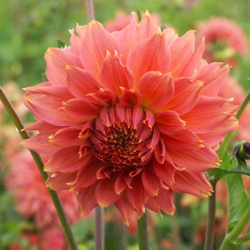 Луковицы георгины бахромчатой Ориндж Фубуки (Dahlia Orange Fubuki) относятся к красивоцветущим травянистым многолетникам. Сорт был выведен в Нидерландах в 2009 году. Луковицы рекомендуется высаживать на солнечных участках, закрытых от сквозняков. Нормально переносит полутень. Расти предпочитает на плодородной почве. Данный сорт относится к самоопыляемым. Взрослые кусты в высоту вырастают около 80 сантиметров. Георгин отличается продолжительным цветением, которое длится с июля до начала октября. Распустившиеся соцветия в диаметре около 12-15 сантиметров. В центре лепестки насыщенного оранжевого оттенка, по краям светло-оранжевая кайма.