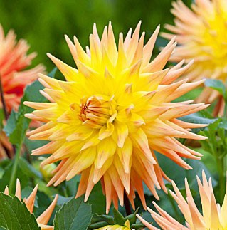 Георгина кактусовая "Райзин Сан" - это великолепное растение с желтыми цветками, которое поразит вас своей красотой и изысканностью. Ее стебель прочный и прямой, а листья имеют необычную форму, напоминающую колючки кактуса. Это растение отличается неприхотливостью и легкостью в уходе.