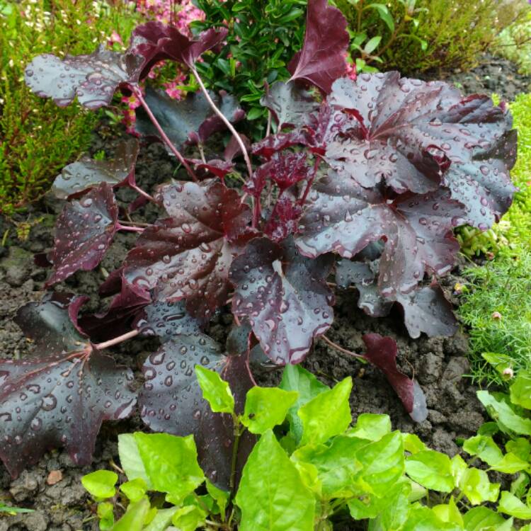 Рассада гейхеры Дарк Мистери (Dark Mystery) украсит любую смешанную клумбу или послужит материалом для эффектной одиночной посадки. Особенностью сорта является необычная форма и расцветка листвы: гофрированные листья имеют пурпурно-коричневую окраску. На протяжении всего лета растение цветет мелкими кремовыми цветочками.