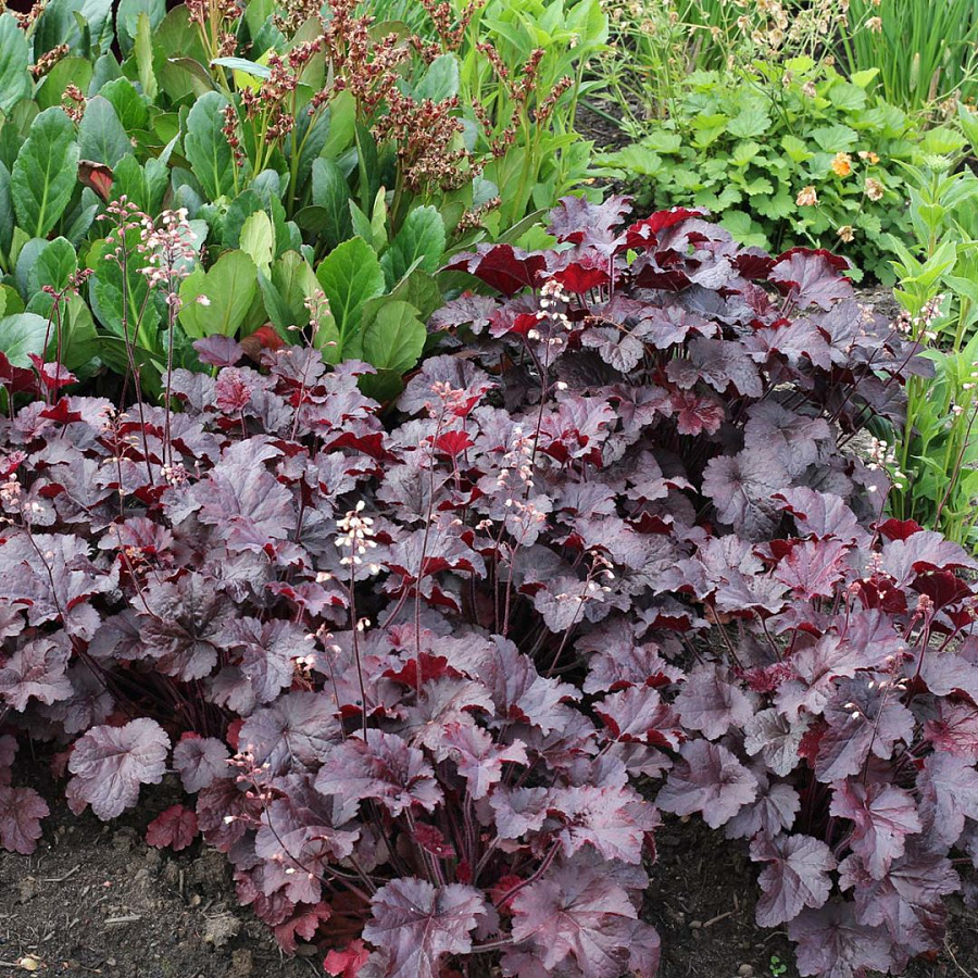 Рассада гейхеры Креола Найт (Creole night) поразит необычной темно-вишневой окраской блестящих листьев. Этот сорт отлично смотрится с розами, астибальдой, геранями и декоративными злаками. С мая по июль многолетник цветет: на длинных стебельках появляются белые метельчатые соцветия.