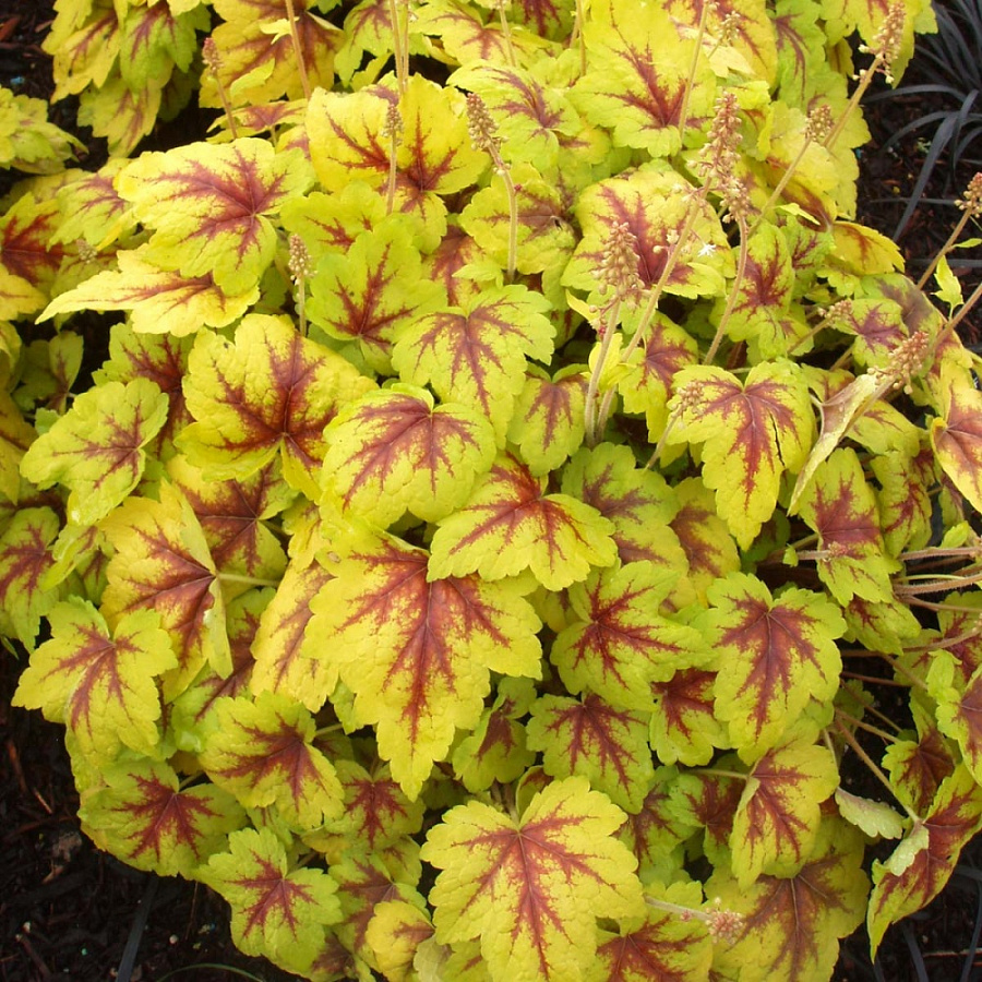 Рассада гейхереллы Стоплайт (Stoplight) – это синтез гейхеры и тиареллы, сочетающий в себе самые лучшие черты обоих сортов – форму листьев и их цвет. Резкий контраст цветов – от красного в середине, до бледно-жёлтого и зелёного на самых кончиках листьев. Из-за трехцветия сорт и был прозван «Светофор». Растения быстро и довольно удобно культивировать. После проращивания семян, рассада может прекрасно адаптироваться практически в любых условиях.