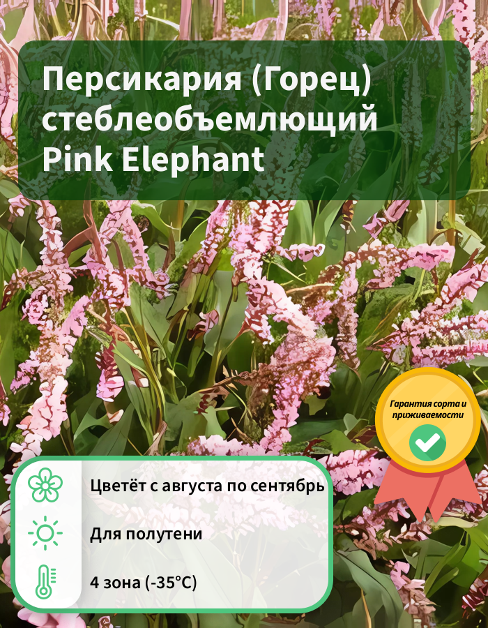 Саженцы Горца стеблеобъемлющего Pink Elephant (Persicaria amplexicaulis) многолетнее растение, которое цветет с июля по сентябрь месяц, достигаю в высоту не более 40 см, а в ширину не более 40 см. растение не требовательно в выборе земли. Главное, чтобы не происходило застоя влаги. В период засухи необходимо обеспечить своевременный полив. Пинк Элефант лучше всего сажать на солнечных пространствах, но также хорошо выдерживает и полутеневые места. Цветет плотно прижатыми друг к другу цветочками на самой верхушке стебля. Цветы имеют насыщенный розовый цвет. На зиму укрывать горец не требуется.