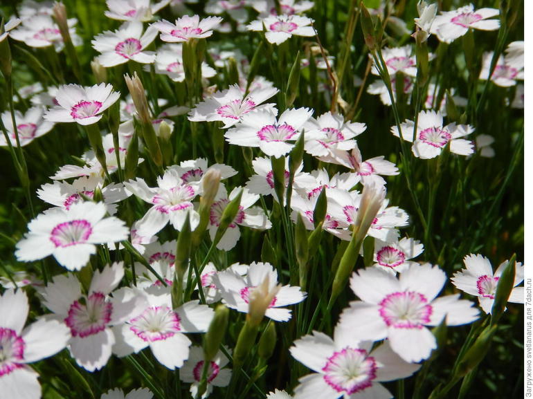 Рассада гвоздики Конфетти Вайт (Confetti White) растет в высоту приблизительно 10-15 см. С мая по октябрь цветет маленькими, нежными цветочками белого цвета. В период цветения напоминает сказочный ковер с ярким орнаментом. Преимущества растения: - не требует обильного удобрения - морозостойкая - быстро разрастается Семена гвоздики Конфетти Вайт лучше посадить на хорошо прогреваемые солнечные участки с легкой песчаной почвой. Может расти и в полутени. Не следует слишком подкармливать удобрениями и переливать, потому что растение начнет гибнуть. Хорошо переносит засуху.