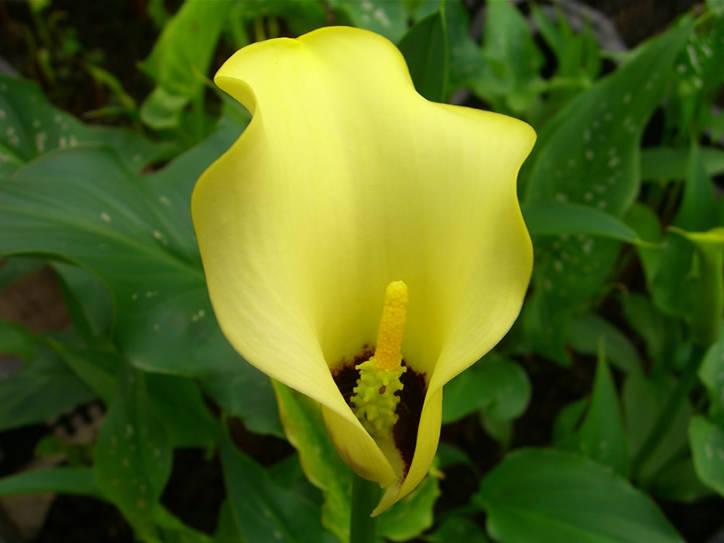 Луковицы Каллы гибридной Блек Меджик (Black Magic Calla) выпускают цветоносы с необычными цветками. По виду они такие же, как и большинство соцветий калл. Ярко-желтый початок укутан зеленовато-желтым покрывалом. Но нижняя внутренняя часть «бокала» окрашена в темно-коричневый цвет. Стреловидные листья крупные и блестящие. Они темно-зеленого цвета, покрыты серебристыми большими вкраплениями. Соцветие держится на кусте в течение 1,5 месяцев. В срезке оно простоит в первозданном виде 5–7 дней. Срезать соцветия необходимо до образования семян, тогда луковица успевает запастись питательными веществами перед зимовкой.