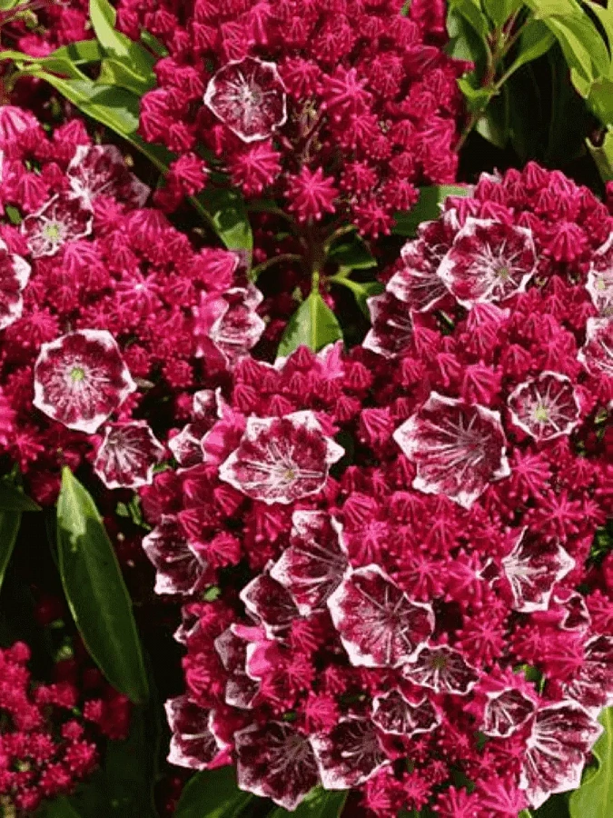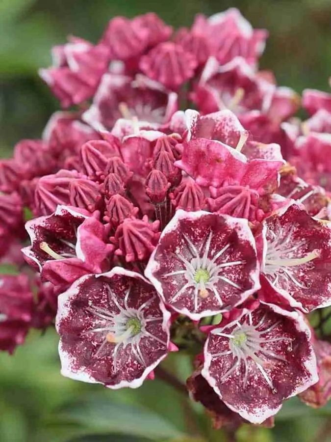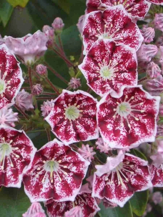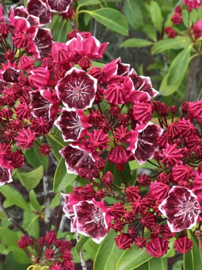 Кальмия широколистная калейдоскоп - это удивительное растение, которое поразит вас своей красотой и изяществом. Ее ствол прочный и прямой, а размеры достигают высоты до 100 см и диаметра до 70 см. Листья этого растения имеют яркую светло-зеленую окраску, создавая неповторимый вид. Цветки кальмии kaleidoscope пурпурные с белым краем, диаметром до 3,8 см, что делает их по-настоящему великолепными.