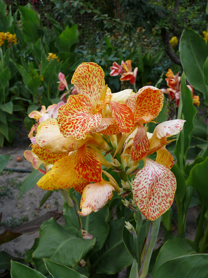 Луковицы Канны гибридной Эн Авант (Canna En Avant) стоит купить на свой дачный участок или для зонирования придомовой части загородного дома. Крупное декоративное растения (до 1 метра в высоту) с крепким стеблем и вытянутыми красивыми листьями (до 60 сантиметров), покоряет изобилием неповторимых (огромных до 13 сантиметров), соцветий желтого цвета с красноватым крапом. Желтая Канна радует цветами с лета до поздней осени, любит много солнца. Она нуждается в обильном поливе и подкормке, на зимовку выкапывается с земляным комом, размножается делением корня. Нежные желтые цветы преобразят любой уголок сада, даже самый невзрачный.