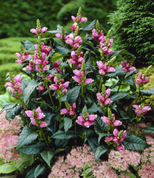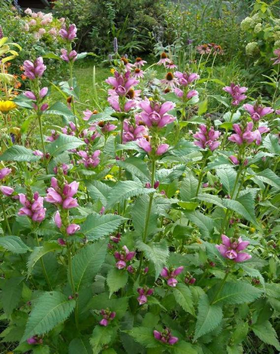 Рассада Хелоне косой зацветает ранней осенью, цветет до первого снега, а иногда и в оттепель. Соцветия колосовидные, группируются на верхушках побегов, цветы небольшие - 1,5 см, в форме пузыря.