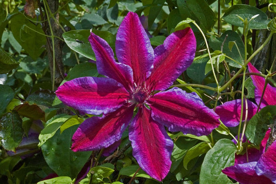 Клематис гибридный Акаиши (Akaishi) - японский высокорослый гибрид с крупными двуцветными цветками. Весной на побегах распускаются цветки диаметром 12-15 см. Лепестки светло-фиолетовой окраски, на которой ярко выделяется сиренево-пурпурная полоса. Для выращивания подходит хорошо освещенное место, которое большую часть дня находится в легком затенении. Предпочитает лёгкие богатую питательными веществами почву. Клематис гибридный Акаиши (Akaishi) следует высаживать вдоль ограждений, решеток, стен и других объектов, способных послужить опорой.