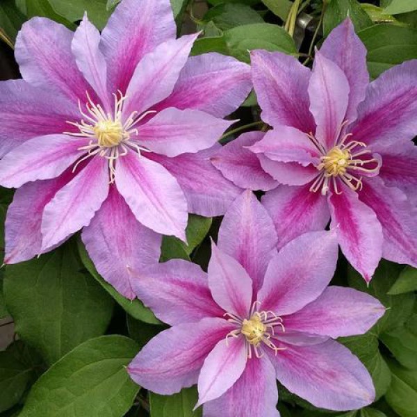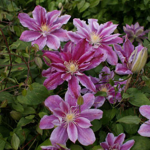 Саженцы клематиса гибридного Рагамаффин (Ragamuffin) относятся к группе крупноцветковых и раннецветущих клематисов, характеризуются умеренным ростом и обильным цветением. В высоту растение достигает 100-150 см. Цветет махровыми цветками с мая по июль на побегах прошлого года, после летней обрезки в августе - сентябре зацветает повторно простыми цветками. Окрас цветка малиново-розовый со светлым краем. Клематис гибридный Рагамаффин (Ragamuffin) хорошо растет и обильно цветет на солнечных или слегка затененных участках с плодородной почвой. Декоративная лиана применяется при создании многоярусных садовых композиций.