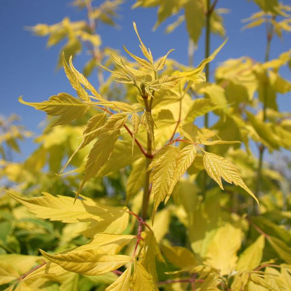 Саженцы клена американского Келлис Голд (Kelly's Gold) – сорт невысоких деревьев, с неравномерной раскидистой кроной и ярко-зеленой листвой с лимонным оттенком. Максимальная высота крупномеров 12 м. Ровные стволы покрыты светло-серой корой. Форма кроны в процессе роста меняет очертания от конической до пирамидальной. Весной дерево цветет мелкими желтыми цветами. Эффектней всего клен американский Келлис Голд выглядит на солнечных местах. Фон из зеленой травы выгодно оттеняет золотисто-зеленый цвет кроны. Достоинства: