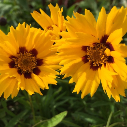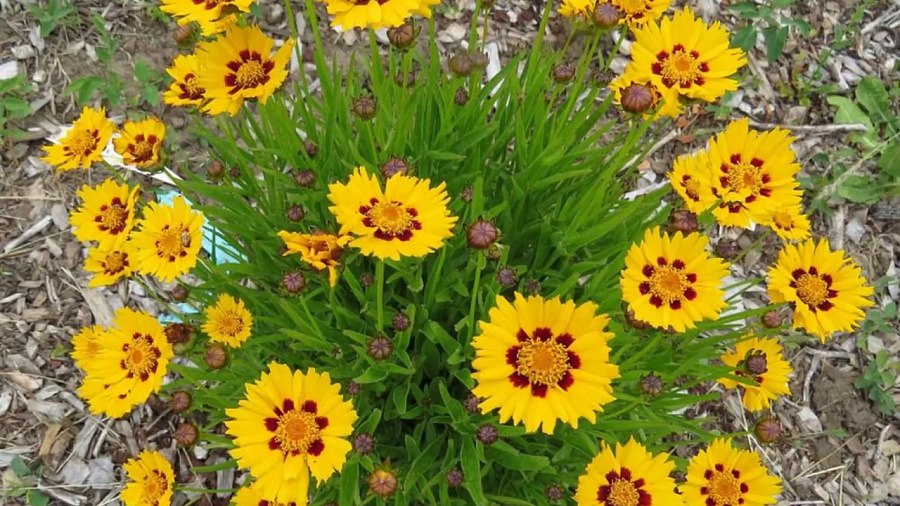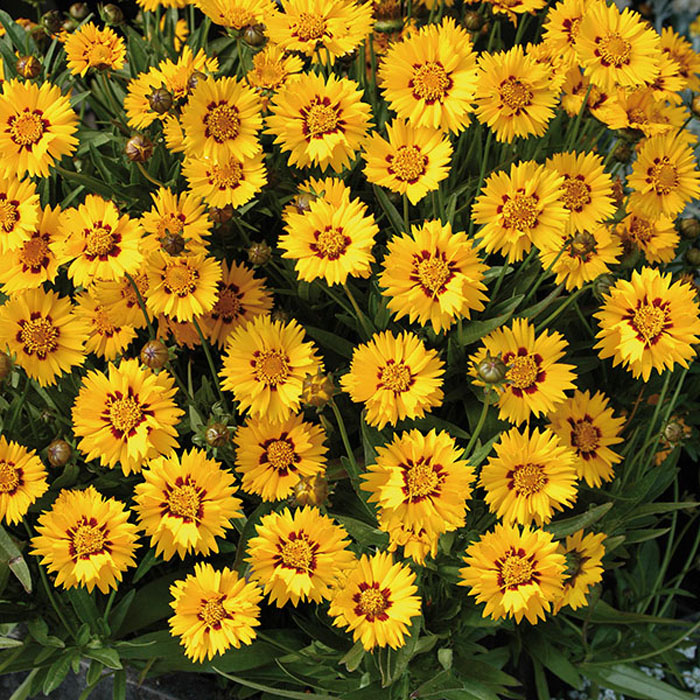 Семена Кореопсиса Санфайр осветят цветник или клумбу яркими солнечными бликами. Очень красивое многолетнее растение. Куст шарообразной формы просто усыпан большими полумахровыми цветами с желтыми лепестками, которые образуют темно-красное кольцо ближе к серединке. Кореопсис Санфайр получил большое распространение благодаря своей неприхотливости, а также длительному цветению – с начала лета до осенних холодов. Чтобы обеспечить буйное цветение, увядшие цветочки необходимо своевременно удалять. После окончания цветения стебли необходимо обрезать, оставив отростки не менее 10-15 сантиметров.