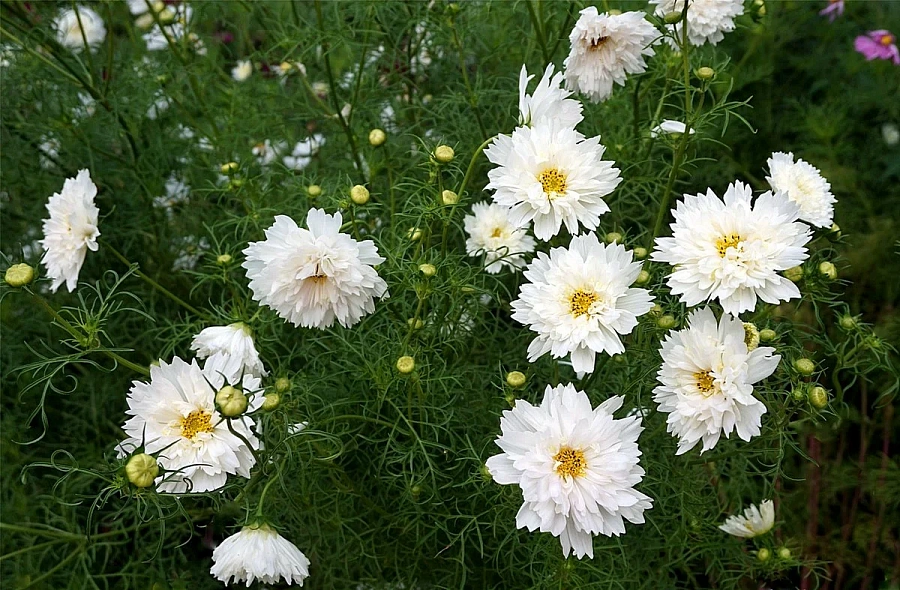 Космея махровая Психе Вайт - это великолепное растение с белыми махровыми цветками, которые радуют глаз своей изысканной красотой. Ее стебли достигают высоты до 80 см, а диаметр цветка может быть от 7 до 10 см. Листья имеют интересную форму и добавляют растению особый шарм.