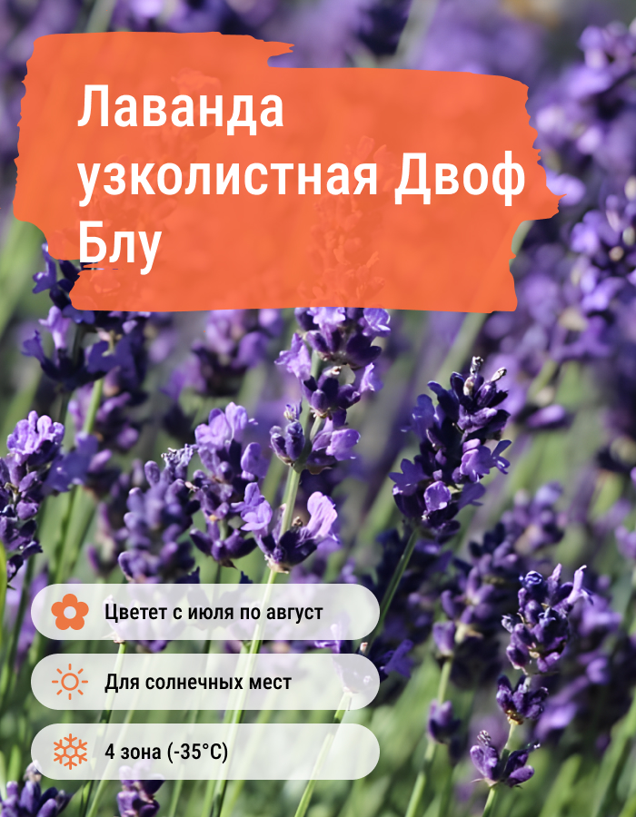 Саженцы лаванды Дварф Блу (Dwarf Blue) не только украсят, но и окружат благоуханием на любом участке, где их высаживают. Превосходно смотрятся бордюры из лаванды. Растение не очень яркой внешности, но обладает изящной неброской красотой. Кусты лаванды – это пушистые невысокие узколистные растения с яркими соцветиям фиолетового цвета в виде колосков. Крупномер Дварф Блу неприхотлив в уходе. Ему требуется: умеренный полив; песчаные или известковые почвы; мульчирование прикорневого участка; ежегодная обрезка; прополки; рыхление. Лаванда теплолюбива и не для всех климатических зон.