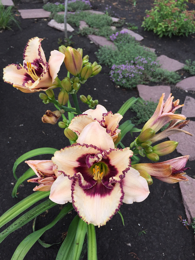 Окраска цветка : кремовый с темно-сливовым пятном и выразительной каймой, горло зеленое