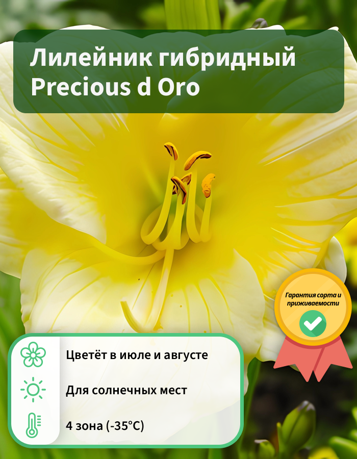Лилейник гибридный Precious d'Oro - травянистое многолетние растение не требует укрытия, хорошо зимуют. Precious d'Oro относится к спящему, повторно цветущему диплоиду со средним сроком цветения, обильно цветущий.  Диаметр кремово-желтых с зеленым горлом цветков достигает 10 см. Лепестки цветка гофрированные. Куст компактный в высоту достигает 50 см. Рекомендуем высаживать растение на хорошо освещенных местах.