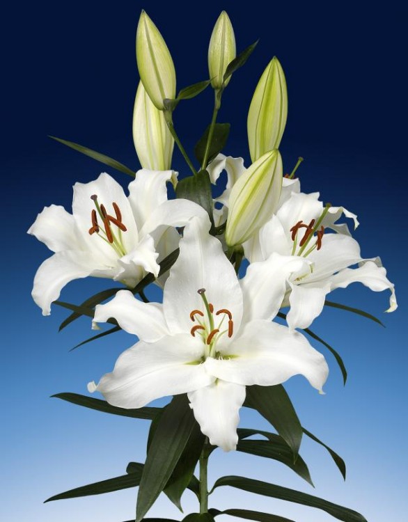Окраска цветка : белоснежный, насыщенно-оранжевые пыльники, лепестки волнистые по краям