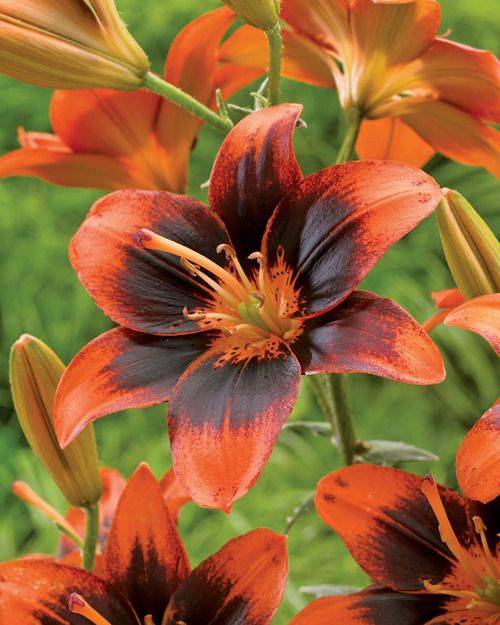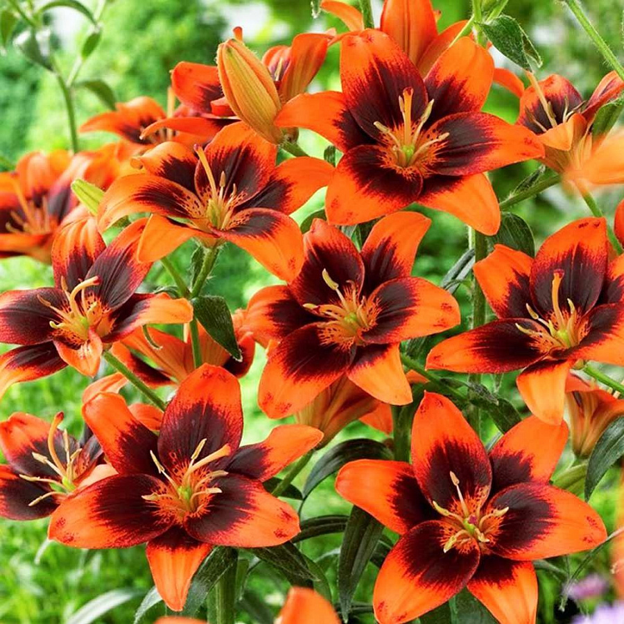 Луковицы азиатской лилии Изи Самба (Lilium asiatic Easy Samba) привлекают внимание фейерверком красок. Стебли прочные, густооблиственные, высотой до 1 м. Цветки крупные, яркой мандариновой окраски с широкими темно-бордовыми мазками и крапом, расходящимися от центра. Период цветения – июнь и июль. Длительность – до 4 недель. Лилии предпочитают солнечные, но защищенные от палящих полуденных лучей участки. Могут расти и в полутени. Хорошо развиваются на рыхлых, плодородных грунтах. Не терпят плотных, подтопляемых почв. В ландшафтном дизайне используются для украшения клумб, а также на срезку.