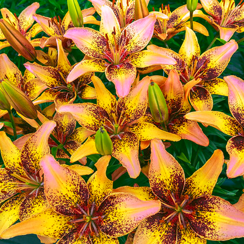 Луковицы лилии азиатской Трайбал Данс (Tribal Dance) относятся к сортам-хамелеонам, меняющим окраску в течение цветения. Это удивительное растение, распускаясь, имеет розово-желтые лепестки с густым бордовым крапом у центра. Затем окраска темнеет от кончиков к центру, цвет становится медно-оранжевым. Запаха бутон не имеет, что важно для людей, страдающих аллергией.