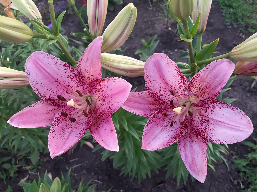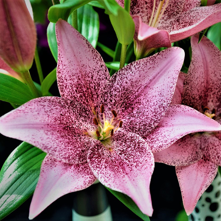 Лилия Ла-гибрид Коголето - это великолепное растение с крупными перламутрово-розовыми цветками, украшенными редким бордовым напылением по краям лепестков. Пыльники темные, что создает удивительный контраст и придает цветку особую изысканность. Высота растения достигает 110 см, а размер цветка равен 20 см, что делает его настоящим королем сада.