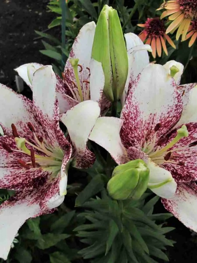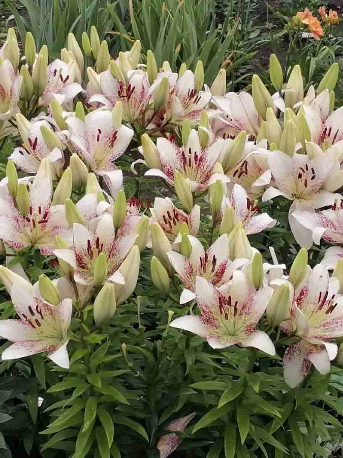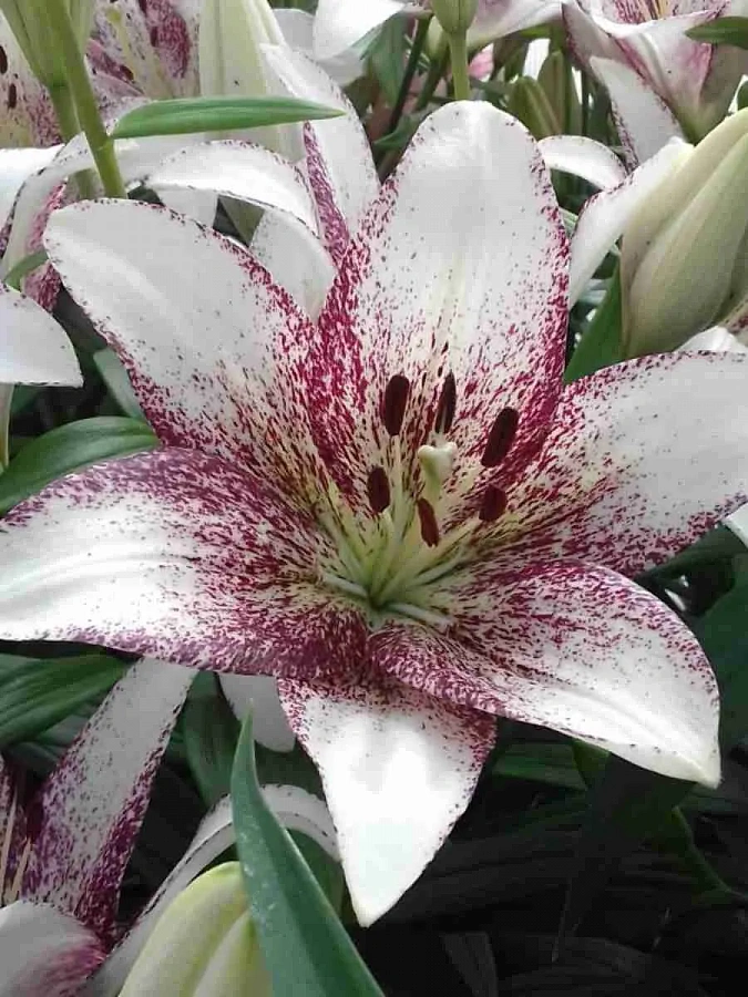 Луковицы лилии ЛА-гибрид Свит Дзаника (Lilium LA-hybrids Sweet Zanica) удивят необыкновенной окраской цветков, которые в середине лета распускаются на крепких стеблях растений. Крупные цветки, напоминающие звезды, имеют диаметр 18-22 см и оригинальную, завораживающую расцветку. Удлиненные лепестки, чисто-белые у самых кончиков, по краям усыпаны мелким вишневым крапом, который становится все гуще ближе к центру цветка. С насыщенным оттенком крапа прекрасно гармонируют бордово-коричневые пыльники тычинок. Как и все ЛА-гибриды, сорт Свит Дзаника неприхотлив и зимостоек.