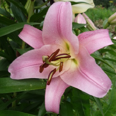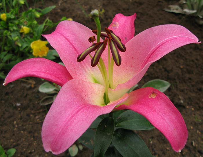 Саженцы и рассада лилии от-гибрид Бейвотч (Lilium) обладают нехарактерной для собратьев своей гибридной группы формой цветка и расцветкой. Однотонный розовый окрас выгодно подчеркивается двумя рельефными полосами по центру лепестков. Тычинки темнеют по мере взросления цветка. Сердцевина цветка более светлая, глубина кажется даже зеленой.