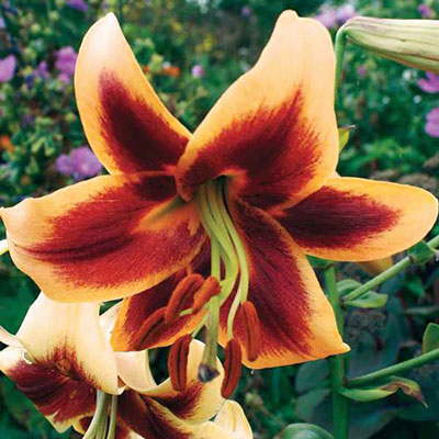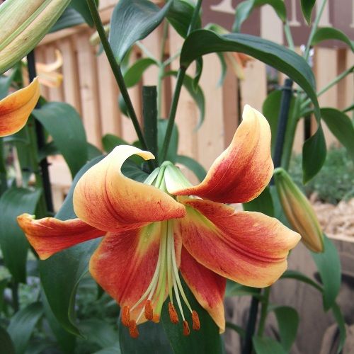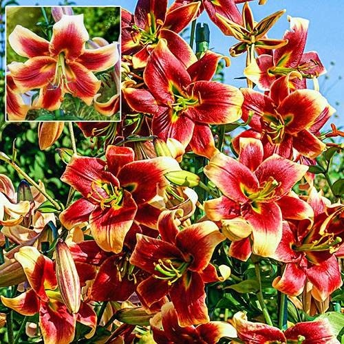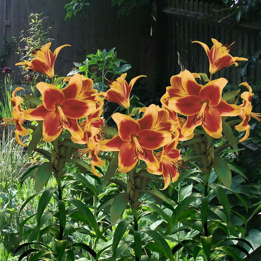 Луковицы лилии ОТ-гибрид Дебби (Lilium OT-hybrid Debby) – для яркого и контрастного сада. Они смогут освежить клумбы и хорошо приживутся на плодородных дренированных почвах. Многолетник вырастает от 90 до 150 см в высоту, причем рост набирает с годами. Цветки начинают раскрываться в середине лета и достигают 16-18 см в диаметре. Окраска лепестков очень яркая, контрастная. Едва заметная зеленая сердцевина переходит в темный красно-оранжевый крупный мазок на каждом лепестке. От середины до кончиков лепестки абрикосово-желтые со слегка загнутыми кончиками. Пыльники кирпично-красные на длинных зеленых ножках.
