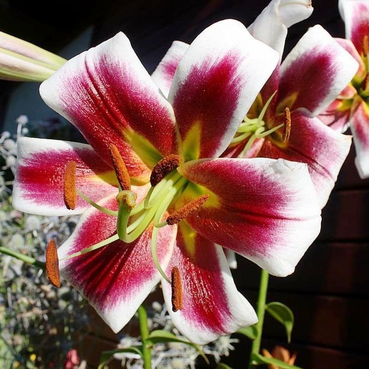 Окраска цветка : бордово-малиновый с белым кантом и кончиками лепестков, пыльники ярко-оранжевые
