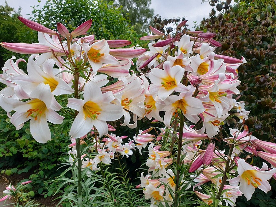 Луковицы лилии Regale растут на увлажненной, богатой органикой, хорошо дренированной почве. Культура светолюбивая, для обильного цветения нуждается в солнечных лучах. В тени растет плохо. Цветки большие, до 20-25 см в диаметре, направлены в стороны и окрашены в розово-желтый цвет, серединка желтая. Такие бутоны эффектно выделяются на фоне ярко-зеленой листвы. Во время цветения от лилии Regale исходит приятный, характерный аромат, в котором улавливаются ноты жасмина. Высота обычно варьируется от 90 до 120-130 см.