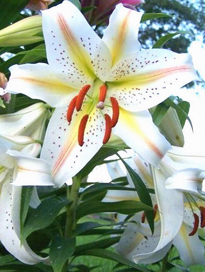 Луковицы лилии восточной горшечной Гарден Парти (Lilium Garden Party) — это пышное компактное растение для дома или сада. В высоту кусты достигают не более 40 см, в конце лета на них появляются цветы до 15–17 см в диаметре. Они распускаются в большом количестве, поэтому за ними практически не видно зелени. Лепестки белые, с тонкой желтой полосой по центру, а также имеют ярко-красный крап и пыльники в тон. Лилия Гарден Парти подходит для выращивания в открытом грунте и в горшках. Она отличается высокой морозостойкостью и легко зимует под укрытием. В домашних условиях ее можно выращивать в любое время года, и она будет радовать ярким обильным цветением.