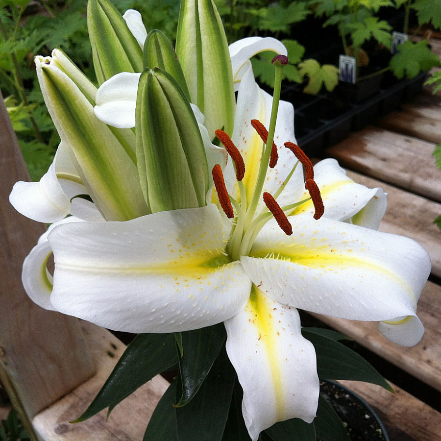 Лилия восточная горшечная Луция - это изысканное растение, которое поражает своей красотой и изяществом. Ее стебель достигает высоты до 45 см, а цветки белого цвета с бледно-желтой полоской радуют глаз размером до 25 см. Лепестки волнистые с загнутыми краями создают неповторимый образ, который наполнит ваш сад утонченным шармом.