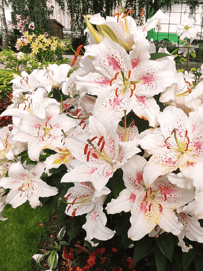 Луковицы лилии восточной Мускадет (Muscadet) вырастают в высокие прочные растения с шикарными белыми соцветиями из атласных лепестков. Цветение сопровождается приятным ароматом. Гофрированные лепестки покрыты малиновыми веснушками и бледно-розовыми внутренними полосками. Стройные стебли усеяны изящными зелеными листьями.