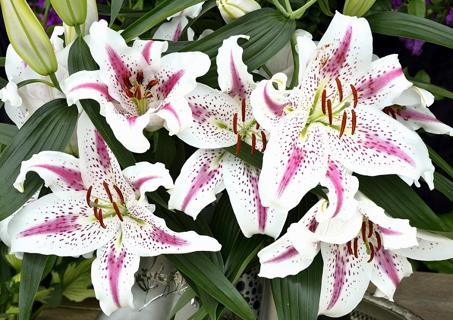 Лилия восточная Spectator - это изысканное растение, которое поразит вас своей красотой и изяществом. Ее крупные цветки белого цвета с нежными малиновыми мазками создадут удивительный акцент в вашем саду или огороде. Высота растения может достигать до 120 см, что делает его заметным элементом в ландшафте. Листья лилии имеют форму, придающую растению особый шарм.