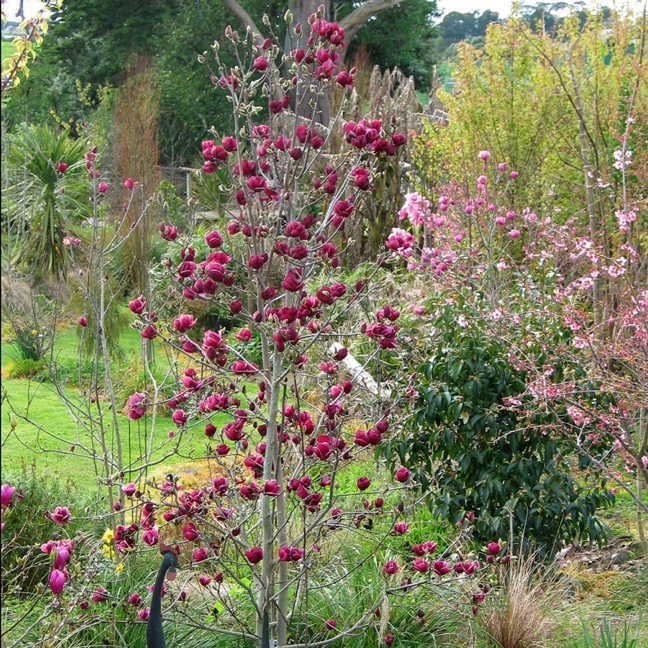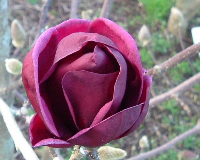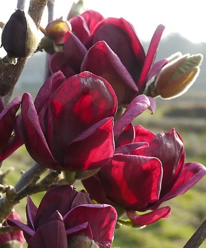 Саженцы Магнолии суланжа Джени (Genie) – тёмноокрашенная магнолия, которую поистине можно назвать самой морозоустойчивой. Ведь растение спокойно переносит погоду в минус 30 градусов. Крона кустарника стремиться вверх, поэтому диаметр не большой – 1.5 сантиметров. Высота магнолии 3 метра. Благодаря компактности сажать растение можно в любом саду, где много солнышка и нет ветра. Бутоны имеют черно-красный цвет и напоминают по форме тюльпаны. Постепенно раскрывая лепестки, цветы достигают 15 сантиметров в диаметре. Этот вид магнолии хорошо подойдёт для маленьких садов, но отлично будут смотреться и на большой площади.