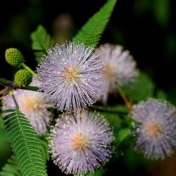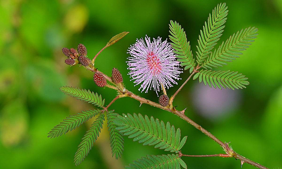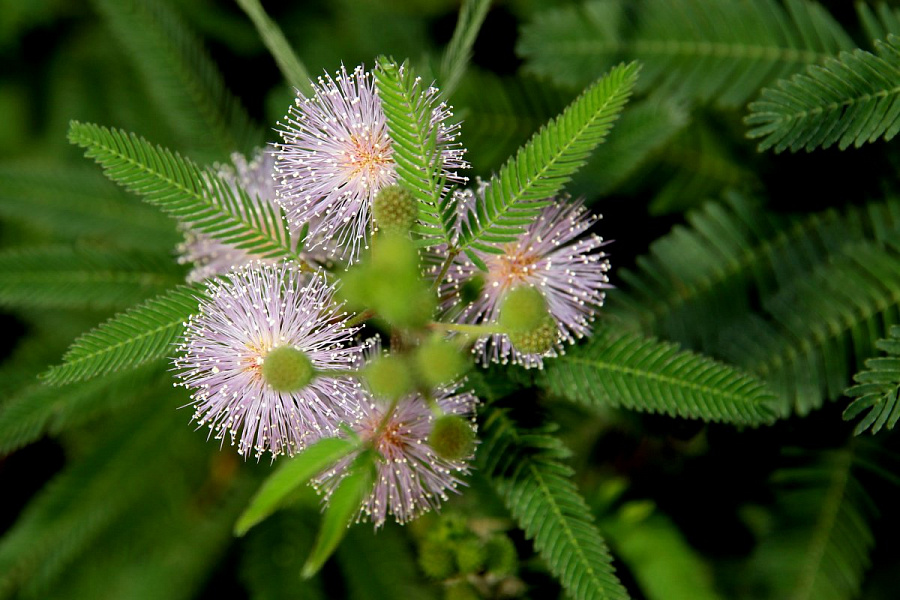 Мимоза стыдливая - это удивительное растение с нежными розовыми цветками, которые раскрываются только при ярком солнечном свете. Ее листья имеют уникальную форму, напоминающую перо птицы, что делает это растение по-настоящему уникальным в вашем саду.