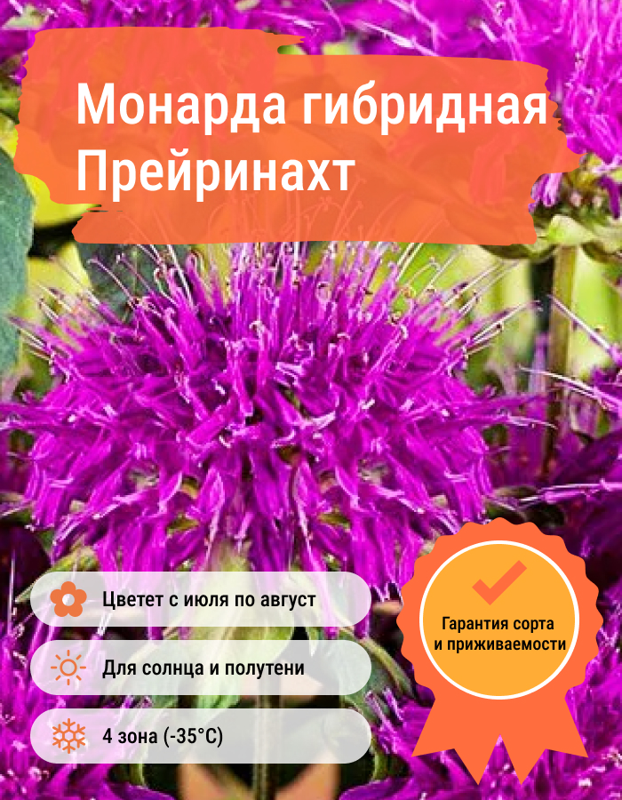 Саженцы Монарды гибридной Прейринахт (Monarda hybrida Preyrinakht) стоит приобрести для дополнения сада или газона яркими, контрастными каплями. Самоопыляемые цветы высотой до 45 сантиметров хорошо смотрятся в обрамляющих дорожки посадках и ярусных миксбордерах. Жесткие ланцетные листья, крепкие темно бордовые стволы и пурпурно-розовые цветки — идеально для центрального элемента букета. Сильный аромат привлекает на участок насекомых-опылителей, поэтому в огороде Монарда также пригодится, тем более она отличается совершенной неприхотливостью к составу почвы и не требует сложного ухода.